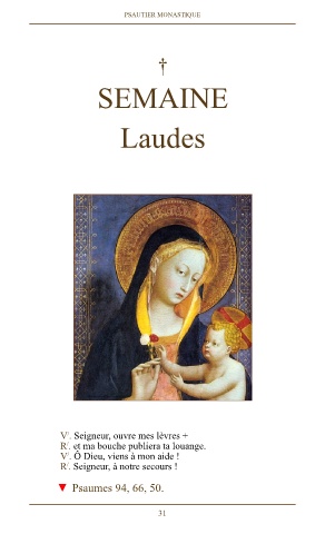 PSAUTIER MONASTIQUE † SEMAINE Laudes / V . Seigneur, ouvre mes lèvres + / R . et ma bouche publiera ta louange. V . Ô Dieu, viens à mon aide ! / / R . Seigneur, à notre secours ! ▼ Psaumes 94, 66, 50. 31