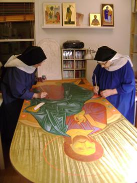 Les Icônes, elle en vit, elle en respire. Dans l'approfon-dissement de la prière du Cœur et du Nom de Jésus, elle travaille à cette beauté de présence des mystères que sont les Icônes. Elle fabrique également des chapelets, dizainiers et rosaires à la louange de la Théotocoste.