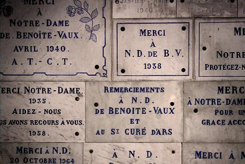 Le temps des miracles. La restauration du sanctuaire et l’enthousiasme populaire qui l’a accompagnée sont l’occasion de nombreux miracles. En 1659, 43 sont canoniquement reconnus (guérisons de sourds, d’aveugles, d’enfants mort-nés…). La chapelle est reconstruite en 1698 et échappe de peu aux horreurs de la guerre de Succession d’Espagne, la statue étant cachée dans le monastère voisin de Notre-Dame de l’Étanche (Meuse). En 1730, Marguerite Herbillon, native de Rosnes (actuelle commune de Raival, à une quinzaine de kilomètres au sud de Benoîte-Vaux), se rend en pèlerinage à pied jusqu’à la chapelle, avec une amie, en portant sa fille de sept ans paralysée d’un bras et des deux jambes, n’ayant pas l’usage de la parole. Dans la forêt, elle s’arrête fatiguée au pied d’un arbre. Une Dame vêtue de blanc lui apparaît alors et lui demande ce qu’elle fait. Elle incite la mère à déposer l’enfant pour qu’elle marche seule. Alors, la fillette se met à courir en appelant : « Maman ! Maman ! » La mère émue perd connaissance. En remerciement de ce fait, resté dans toutes les mémoires à Rosnes, le père fit peindre un ex-voto placé dans la chapelle de Benoîte-Vaux.