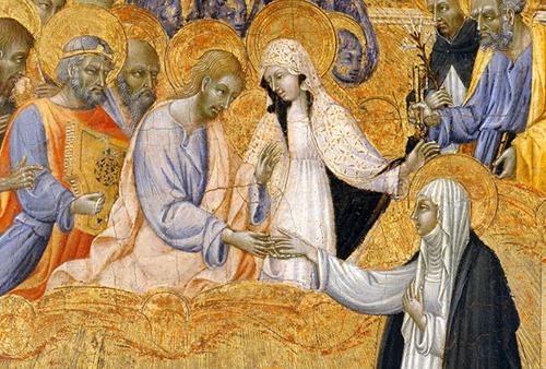 L’épouse du Christ. En réponse à cette vision, Catherine fait vœu de virginité et elle se soumet à une ascèse faite de pénitence, de prière et de solitude dans une pièce retirée de la maison paternelle. Mais sa famille, souhaitant la marier, lui impose les tâches ménagères comme dérivatif à ces mortifications. Les relations entre Catherine et ses parents sont particulièrement mauvaises. C’est à ce moment qu’elle fait l’expérience spirituelle de la « cellule intérieure » du cœur, lieu inviolable où, quelles que soient les circonstances extérieures, le Christ est toujours présent. Catherine a toujours manifesté une grande admiration pour les Frères Prêcheurs, fondés par saint Dominique en 1216. Elle demande son admission chez les Mantellate (sorte de tiers-ordre dominicain), une confrérie de femmes, veuves et âgées pour la plupart, qui l’accueillent alors qu’elle a juste 16 ans ! Ses parents ont, en effet, enfin compris et accepté la vocation de leur fille. Revêtue de l’habit blanc et du manteau noir, elle veut vivre les exigences dont ils sont les symboles : pureté et pénitence. Les grâces mystiques abondent jusqu’aux noces mystiques avec son époux, le Christ, en 1368. Jésus lui apparaît et lui remet un anneau, symbole de leur union spirituelle.