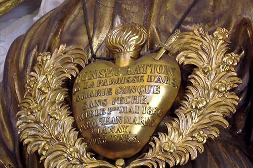 À Ars, une pastorale concrète marquée par de grands événements. C'est surtout à Ars-sur-Formans (Ain) que le nouveau prêtre donnera la mesure de sa dévotion à la Vierge. Cette dévotion est, avec son culte envers l'Eucharistie, le grand ressort de sa sainteté. Il fonde d'abord la confrérie du Saint Rosaire pour les jeunes filles de la paroisse. En 1820, il restaure la chapelle de la Vierge, bien trop modeste à son goût. La statue dorée qu'on y voit encore sera achetée en 1834 après les apparitions de Notre-Dame à sainte Catherine Labouré. Le Curé d'Ars en a entendu parler et y fera allusion dans ses catéchismes. En 1823, Mr Vianney organise un pèlerinage paroissial d'action de grâces à Notre-Dame de Fourvière. Le 1er mai 1836 a lieu la consécration de la paroisse à l'Immaculée-Conception (18 ans avant la proclamation du dogme !) Les noms de ses paroissiens sont placés dans un cœur de vermeil suspendu au cou de la Vierge Marie. En 1844, il installe une statue de Marie au-dessus de la porte principale de l'église car « Marie est la portière du ciel ». Le 8 décembre 1854, il fête avec beaucoup de solennité la proclamation du dogme de l'Immaculée-Conception. « J'ai toujours pensé qu'il manquait un rayon à l'éclat des vérités catholiques. C'est une lacune qui ne pouvait demeurer dans la Religion. »