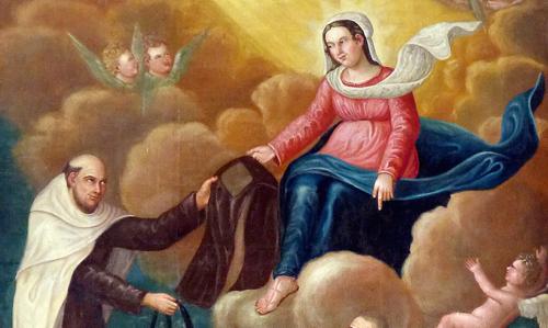 Travailler pour être sauvé. Un second point aura pu surprendre Simon : si Marie parle de Salut (« qui mourra ainsi revêtu sera sauvé »), elle fait tout autant comprendre que celui-ci ne saurait être acquis par le simple fait d’accepter de revêtir sa livrée ! Le symbole de l’habit dont une mère revêt son petit enfant est par lui-même significatif : de même qu’une mère habille son nouveau-né car celui-ci est incapable de s’habiller par lui-même, de même Marie souhaite habiller ses enfants du Salut que personne ne pourrait acquérir par soi-même. Mais en recevant des mains de Marie un Scapulaire, Simon ne reçoit pas un habit blanc, cette couleur éclatante symbolisant le Salut dans le corpus biblique. Il reçoit au contraire un habit de couleur terne, car le Scapulaire, au XIIIe siècle, est une simple tenue de travail ! Les paysans allant travailler aux champs, les forgerons s’apprêtant à travailler le fer et le feu, ou autres, pouvaient se revêtir de cet habit composé au départ de deux grands pans de tissus mis par-dessus les épaules, couvrant l’avant et l’arrière du corps, pour éviter de salir, de brûler ou de déchirer leurs vêtements habituels. Dès 1280, le registre de la confrérie de Florence nous informe que le Scapulaire, porté par des laïcs (les carmes ne le portant pas encore !), a commencé à se réduire, probablement pour des raisons d’ordre pratique. Il ne descend plus qu’au niveau de la taille… Il en existe d’ailleurs près d’une vingtaine d’autres types que celui de Notre-Dame du mont Carmel. En tout cas, tout fidèle revêtant le Scapulaire est invité à se mettre au travail : Marie lui demande implicitement de coopérer, de travailler à son propre Salut, en mettant en pratique les commandements donnés par le Christ. « Pourquoi m’appelez-vous « Seigneur, Seigneur », et ne faites-vous pas ce que je dis ? » (Luc VI, 46), demande Jésus aux foules qui le suivent…