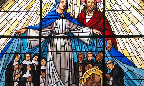 La Mère des Prêcheurs. Revenu à sa prière, poursuit sœur Cécile, Dominique est ravi en esprit devant Dieu. La Vierge Marie est assise à sa droite, vêtue d’une chape de couleur saphir. Des religieux de tous les ordres contemplent le Seigneur et sa Mère mais on n’y voit pas de Prêcheurs. Dominique pleure amèrement. Marie et son Fils l’appellent et lui demandent les raisons de sa tristesse. « Veux-tu voir ton ordre ? », lui demande Jésus. « Oui, Seigneur », répond Dominique en tremblant. Et, raconte la moniale, « le Seigneur mettant la main sur l’épaule de la bienheureuse Vierge, dit au bienheureux Dominique : j’ai confié ton ordre à ma mère. » La Vierge ouvre alors la chape qui la couvrait, si vaste « qu’elle semblait couvrir toute la patrie céleste » et, abritée dans les plis de ce manteau, Dominique voit une grande multitude de Frères. « La bienheureuse Vierge Marie fut l’aide principale dans la fondation de l’Ordre, et l’on espère qu’elle le conduira à bon port », écrit Humbert de Romans, quatrième successeur de saint Dominique. La Mère du Verbe est aussi la Mère des Prêcheurs.