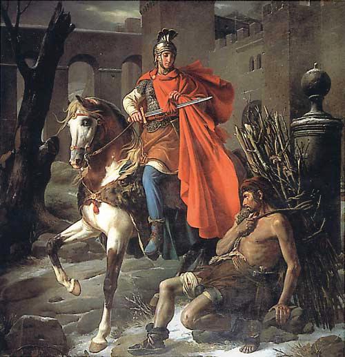 À l’hiver 334, il est affecté à Amiens. Il est sans le sou : il distribue sa solde aux pauvres. Peu après, c’est la célèbre scène du partage de son manteau avec un mendiant qui a froid. S'il ne lui donne que la moitié, c'est que l'autre moitié de son équipement appartient à Rome. La nuit suivante, le Christ lui apparaît, vêtu de ce même morceau d’étoffe. Le reste de son manteau – ou cape – deviendra une relique conservée dans la chapelle palatine de Charlemagne à Aix-la-Chapelle (aujourd’hui en Allemagne). Le mot « chapelle » (cappella en italien) est d’ailleurs tiré de ce terme de cape.
