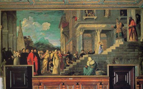 Dans le Protévangile de Jacques, l’entrée de Marie au Temple est traitée fort brièvement (ch. 7) ; elle y demeure jusqu’à l’âge de douze ans. Le Pseudo-Matthieu (ch. 4 à 6) est plus prolixe. Marie déjà élevée dans la maison familiale comme dans un sanctuaire, sevrée à trois ans, est conduite au temple par ses parents pour être confiée à la communauté des vierges : « Elle monta en courant les quinze marches du temple sans regarder en arrière ». Cette scène a été abondamment représentée. Est alors développée la règle de vie monastique qu’elle s’est imposée et qu’elle suit avec zèle, une règle conforme à celle menée dans les couvents au VIIe siècle : liturgie des heures, travail manuel et prière. Ses qualités sont exaltées : elle est « la plus instruite dans la connaissance de la Loi de Dieu, la plus humble en humilité, la plus admirable dans les cantiques de David, la plus empressée en charité, la plus pure en chasteté, la plus parfaite en toute vertu […] Sans cesse, elle bénissait Dieu et, pour ne pas être interrompue, même par un salut, dans la louange du Seigneur, chaque fois qu’on la saluait, elle, à son tour, disait en réponse : Deo gratias » Et l’auteur de commenter : « Ainsi, c’est d’elle qu’est venu l’usage des hommes pieux de répondre Deo gratias quand ils se saluent entre eux » ; ainsi est donné un ancrage marial à un pieux comportement préconisé par saintBenoît au VIe s. (Règle, 66). En outre, Marie qui nourrit les pauvres et guérit les malades, était, elle, nourrie chaque jour par un ange et « souvent on voyait des anges s’entretenir avec elle et ils lui obéissaient ». C’est dire que Marie atteignait dans le Temple cette « vie angélique » (bios aggelikos) à laquelle, en Égypte, aspirent les Pères du désert au IVe s. et qui la préparait à être la mère virginale de l’Enfant-Dieu.