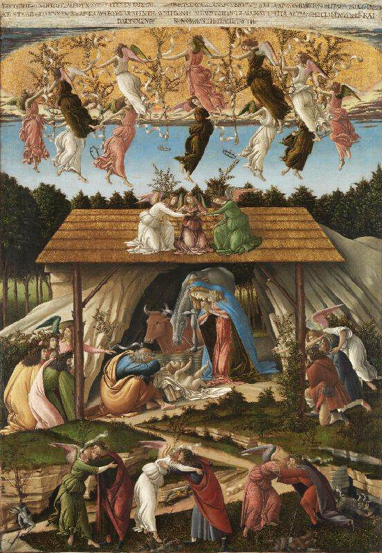 La 'Nativité mystique' montre des anges et des hommes célébrant la naissance de Jésus-Christ. La Vierge Marie s'agenouille en adoration devant son fils, surveillée par le bœuf et l'âne à la crèche. Le mari de Marie, Joseph , dort à proximité. Les bergers et les sages sont venus visiter le roi nouveau-né. Les anges dans les cieux dansent et chantent des hymnes de louange. Sur terre, ils proclament la paix, embrassant joyeusement des hommes vertueux tandis que sept démons fuient vaincus dans le monde souterrain.