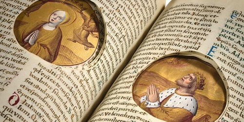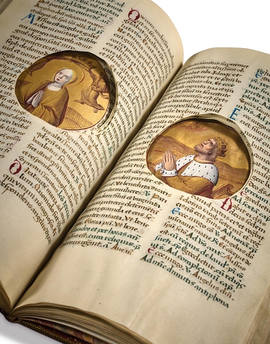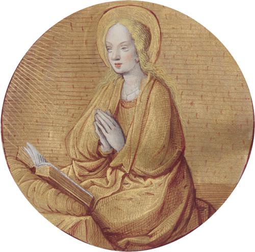 L’artiste a procédé à un évidement circulaire sur chaque page, donnant l’impression qu’on a troué les pages. « Certains ont cru que des médaillons enluminés avaient été découpés, mais pas du tout. L’artiste a procédé à une mise en abîme pour permettre au fidèle de continuer à voir l’image tout en lisant le texte », explique Ariane Adeline. Le rapport entre texte et image est ici d’une grande ingéniosité. Le fidèle peut ainsi continuer à méditer sur les textes de la Vierge Marie tout en admirant son portrait sur le médaillon. Pour contrecarrer le manque de place dû à ces fameux « trous », le texte a été placé sur deux colonnes. « C’est une mise en page qui se faisait très peu en France », souligne Ariane Adeline.