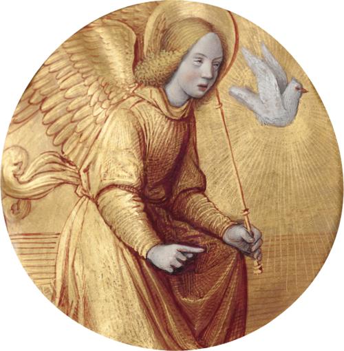 Dans la lignée de Jean Fouquet, Jean Poyer a utilisé un très beau camaïeu d’or pour composer ses médaillons, mais en le développant davantage que son prédécesseur. « Les médaillons sont agrémentés de quelques touches de couleurs bleutées, violacées, rosées… Il joue sur les tonalités pour rehausser l’or », explique Ariane Adeline.