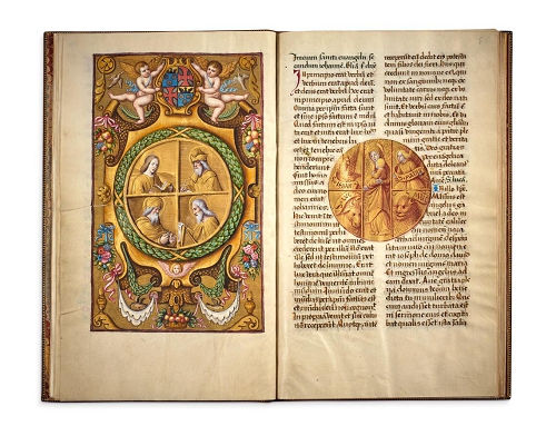 Les extraits des Évangiles et la prière Obsecrotesont illustrés par des médaillons qui montrent les quatre évangélistes et la Vierge à l'Enfant accompagnée de leurs symboles. Le cartouche sur fond d'or qui entoure le médaillon des quatre évangélistes a été ajouté au XVIIe siècles, l'écu soutenu par deux putti contenant les armoiries de la famille Petau.