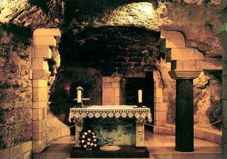 Le sanctuaire que nous visitons est construit sur une grotte qui constituait une partie de l’habitation de la sainte famille, l’autre partie était construite en pierre de taille, pierres qui furent acheminées en Italie, à Lorette (Loreto) en l’an 1294.