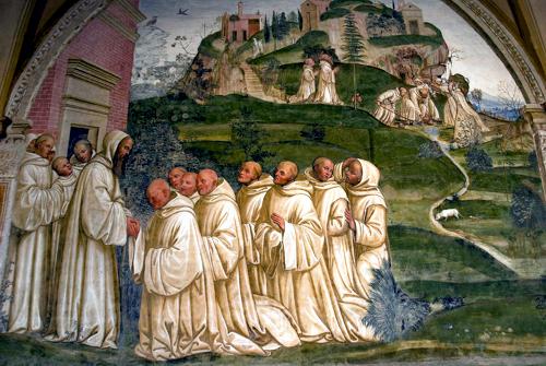Grande scène dont la composition soignée fait parts égales entre portraits, paysage et anecdote. Au premier plan, Benoît, qui se tient debout entouré de quelques frères (dont saint Placide) est supplié par une délégation de huit moines agenouillés devant lui. Au second plan et au-dessus, au flanc d'une colline au sommet de laquelle se dressent les trois monastères mentionnés par la Légende Dorée Benoît et Placide, agenouillés, prient ensemble tandis qu'au-dessous, des moines que l'artiste a saisis en plein mouvement, creusent à l'endroit révélé et marqué de trois pierres par le saint, pour faire jaillir la source. L'eau s'écoule le long de la pente et l'œil du spectateur est ainsi attiré vers une chienne blanche qui le ramène enfin au groupe du premier plan.
