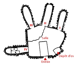 Le tombeau, entièrement creusé dans le roc, consiste en une salle centrale sur laquelle donnent un cubicule pour y déposer des ossements et quatre « fours » (fig. 1, I à IV). On appelle « four » (kokh) une chambrette creusée perpendiculairement à la paroi de la salle, dont le sommet arqué lui donne bien l'aspect d'un four. Ces « fours » mesurent en moyenne 1,90 m de profondeur, 46 cm de largeur et 60 cm de hauteur. On y dépose le corps des défunts; quand les os sont complètement décharnés, on les recueille dans un petit coffret de calcaire tendre, qu'on appelle « ossuaire », ordinairement inscrit au nom du ou des défunts, que l'on range ensuite le long des parois de la salle et même dans les « fours » eux-mêmes. Il s'agit donc, en fait, d'une seconde sépulture. Ce type de sépulture n'a été utilisé par les Juifs qu'au cours de la période mentionnée plus haut. Ce n'est que très rarement qu'on y a encore recours après 70 après J.-C. On a pu compter dans le présent tombeau au moins douze ossuaires; une dizaine d'entre eux avaient été saccagés par des violeurs de tombes, dès l'Antiquité, mais deux étaient restés intacts, dans le four IV, et allaient susciter un vif intérêt, comme on va le comprendre plus loin.