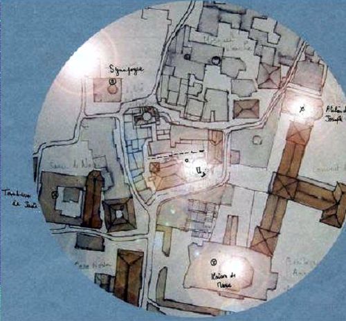 Plan du quadrilatère définissant, selon la Tradition, le cadre de vie historique de la vie de Jésus et de la Sainte Famille, pendant 30 ans à Nazareth : entre la maison de Marie, l’atelier de Joseph, la Synagogue, et le Tombeau du Juste, souvent attribué à Joseph