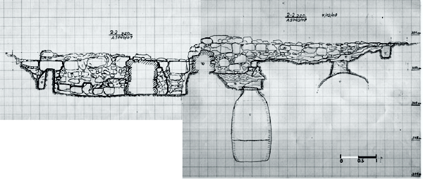 Coupe transversale des fouilles archéologiques montrant la cache découverte et une des citernes qui reste encore à vider