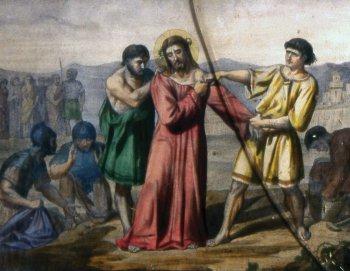 « Ils se sont partagé mes vêtements et ils ont tiré ma robe au sort » (Ps. XXI, 19). C'est la prophétie du psalmiste. — Jésus est dépouillé de tout et mis dans la nudité d'une pauvreté absolue, il ne dispose pas même de ses vêtements; car dès qu'il sera élevé en croix, les soldats se les partageront et jetteront sa tunique au sort. — Jésus par un mouvement de l'Esprit-Saint: Per Spiritum sanctum semetipsum obtulit Deo (Hebr. IX, 14), s'abandonne à ses bourreaux comme victime pour nos péchés.