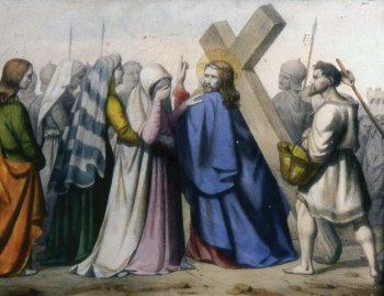 Le jour est venu pour la Vierge Marie où doit se réaliser pleinement en elle la prophétie de Siméon: « Un glaive percera votre âme » (Luc. II, 35). — De même qu'elle s'était unie à Jésus en l'offrant jadis au Temple, elle veut plus que jamais entrer dans ses sentiments et partager ses souffrances, à cette heure où Jésus va consommer son sacrifice. Elle se rend au Calvaire où elle sait que son Fils doit être crucifié. Sur la route, elle le rencontre. Quelle immense douleur de le voir dans cet affreux état! Leurs regards s'échangent, et l'abîme des souffrances de Jésus appelle l'abîme de la compassion de sa Mère. Que ne ferait-elle pas pour lui!