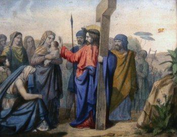 « Jésus était suivi d'une grande foule de peuple et de femmes qui se frappaient la poitrine et se lamentaient sur lui. Se tournant vers elles, Jésus dit: Filles de Jérusalem, ne pleurez pas sur moi, mais pleurez sur vous-mêmes et sur vos enfants, car des jours viendront où l'on dira: Bienheureuses celles qui furent stériles... Et les hommes crieront aux montagnes: tombez sur nous... Car si le bois vert est ainsi traité, que fera-t-on du bois sec ? » (Luc. XXIII, 27-31).
