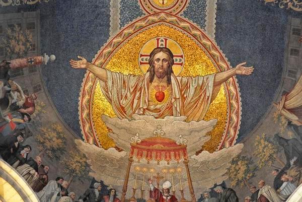 L'Eglise, unie au Christ, naît d'un Cœur blesse. De ce Cœur transperce de part en part, nous arrive la Vie. Comment ne pas rappeler ici, ne serait-ce qu'au passage, les sacrements, à travers lesquels Dieu agit en nous et nous fait participer à la force rédemptrice du Christ? Comment ne pas rappeler avec une gratitude particulière le très Saint Sacrement de l'Eucharistie, le Saint Sacrifice du Calvaire et son constant renouvellement sous une forme non sanglante dans notre Messe ? Jésus s'offre à nous comme aliment: parce que Jésus est venu à nous, tout a changé, et nous recevons des forces — l'aide de l'Esprit Saint — qui comblent notre âme, dirigent nos actions, notre manière de penser et de sentir. Le Cœur du Christ est pour le chrétien une source de paix.