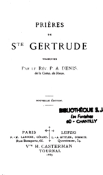 Je m'en remets à votre intercession et à vos mérites, Sainte Gertrude, et vous prie de considérer mon fidèle amour et ma ferme confiance que mon cœur vous porte; veuillez inscrire dans votre cœur mon nom et faites que je compte parmi ceux que vous aimez et protégez de façon toute particulière, afin que ma vie soit agréable à Dieu. Ainsi soit-il.